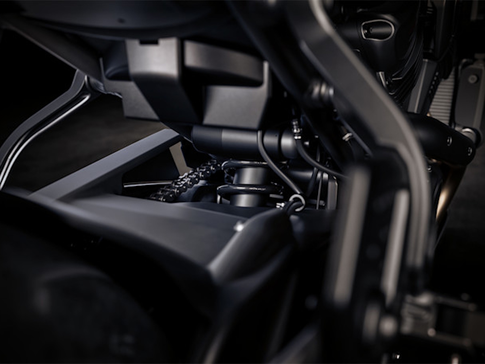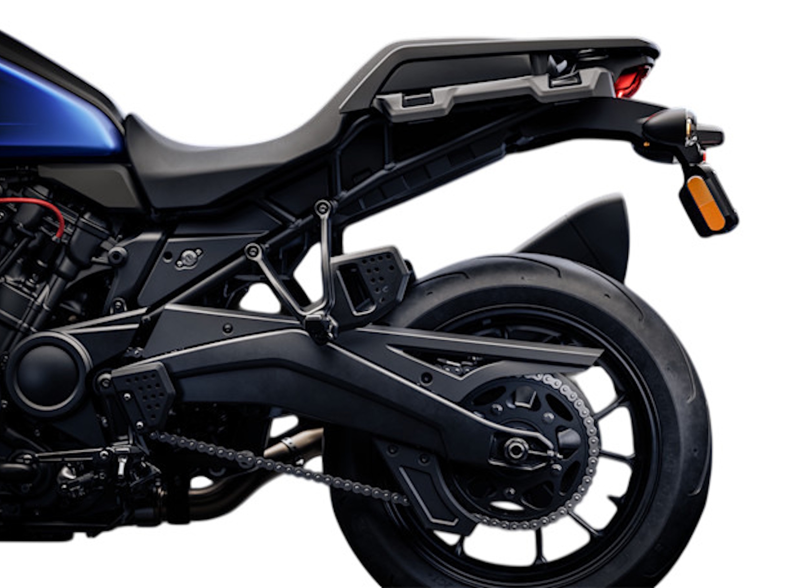 A darker, sleeker look with black finishes and non-highlighted fins, matched to a lighter exhaust that trims weight and sharpens the bike’s street stance.