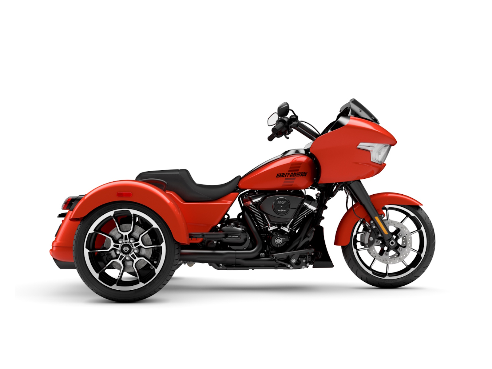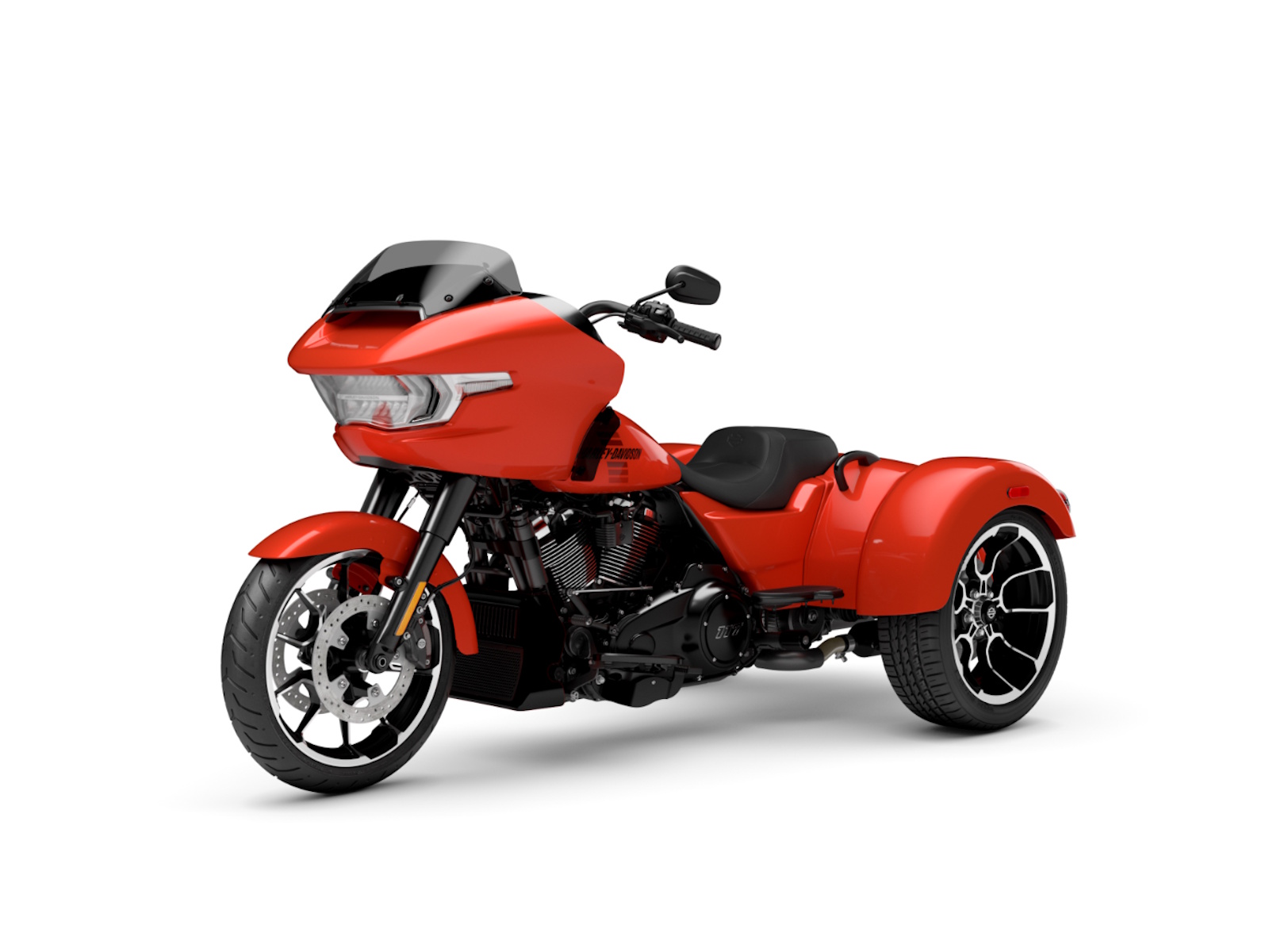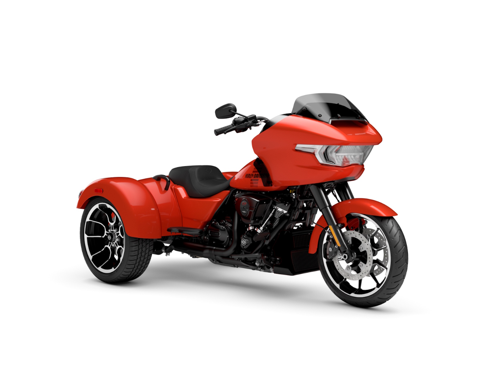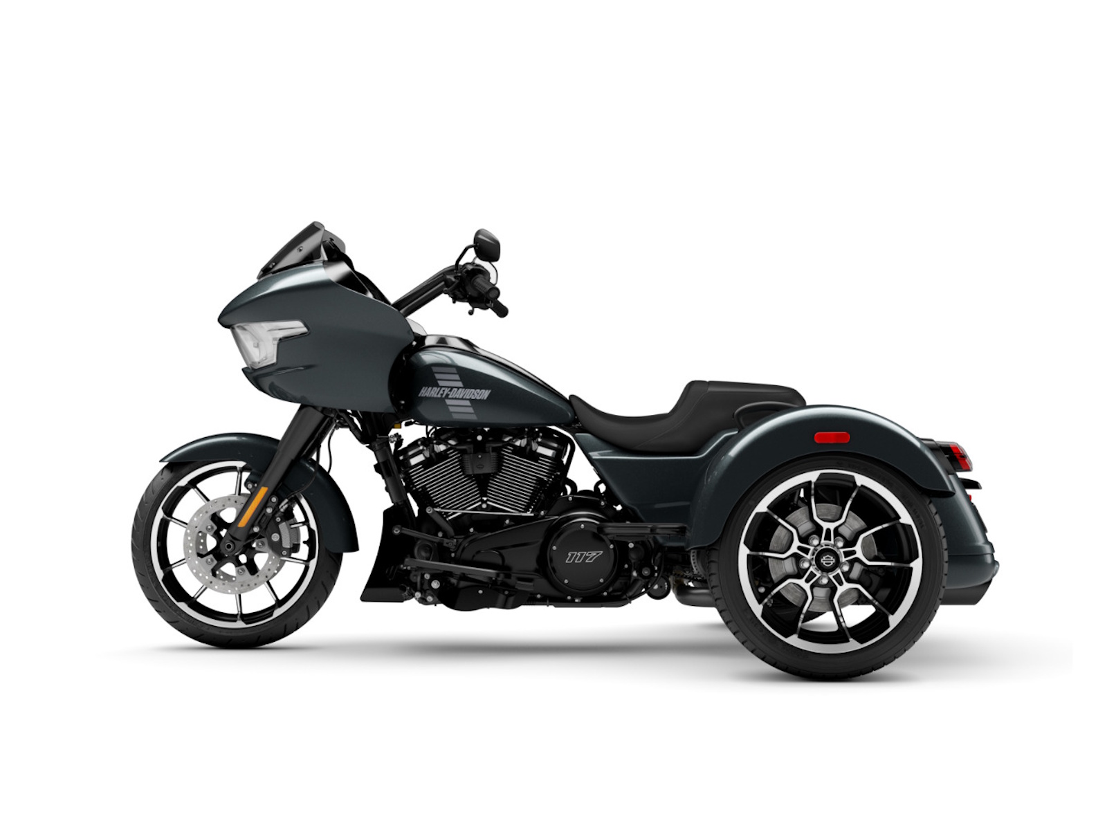 The new 2026 Harley-Davidson Road Glide 3 rewrites what a trike can be. It's leaner, it's meaner, and it's built for all get out. A redesigned Sharknose fairing cuts a sharper profile over a planted, aggressive stance. A Milwaukee-Eight® VVT 117 motor is at the center of its hot-rod heart, and its brand new, completely redesigned rear suspension does two things: grip and go. The 12.3" TFT with Skyline™ OS, along with LED lighting, Rider Safety Enhancements, and four selectable ride modes keep this one ready for street and strip.