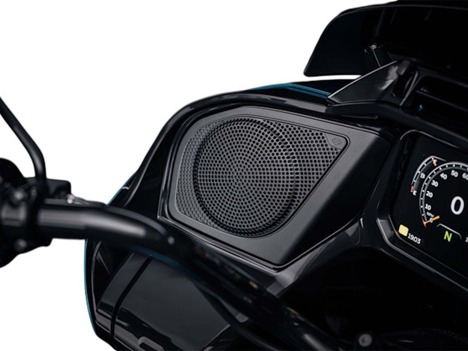 A 4‑channel, 200‑watt amp rated at 50 watts per channel drives in‑fairing speakers built to cut through wind and engine noise, with every setting at your fingertips on the Skyline OS 12.3” TFT display.