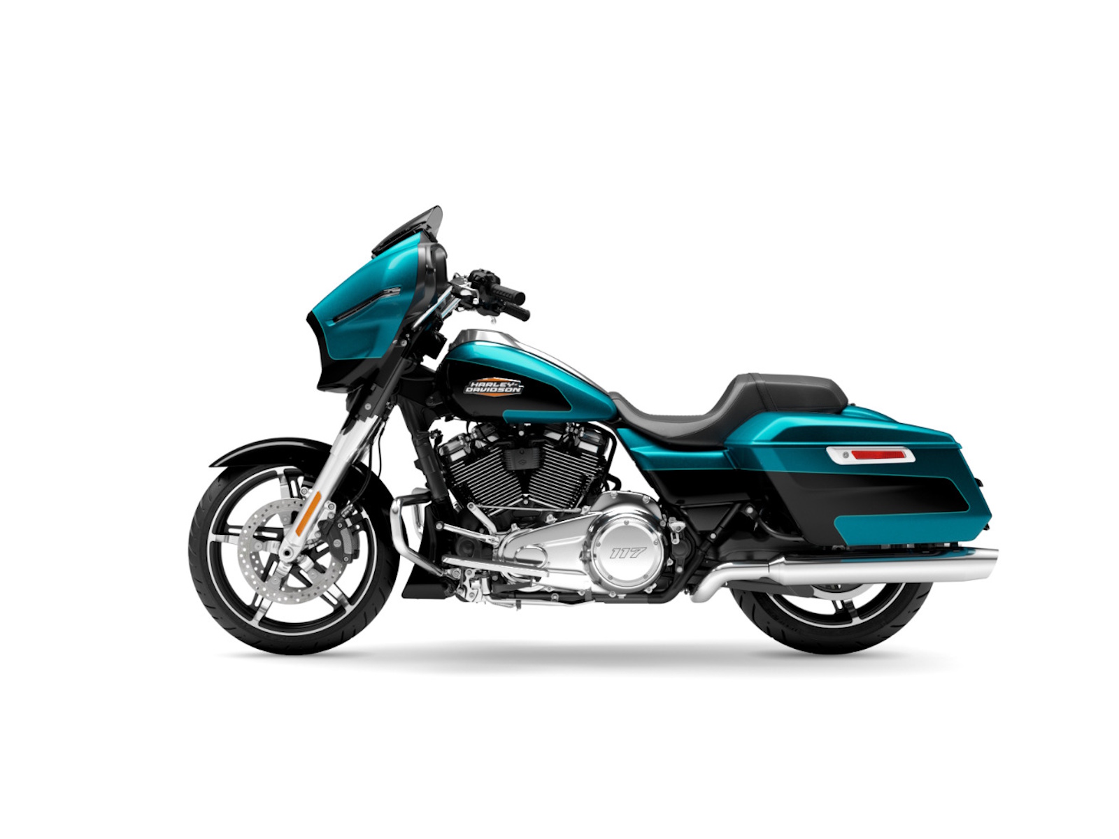 The Milwaukee-Eight 117 delivers 105 HP and 130 ft-lbs. of torque, with liquid-cooled heads and a center-mounted radiator to keep both performance and rider comfortable when the temps climb, whether you’re crawling through traffic or chasing sky.
