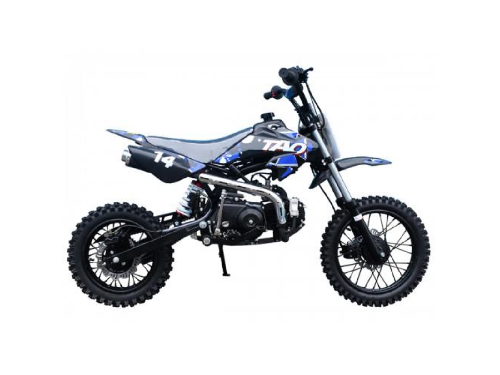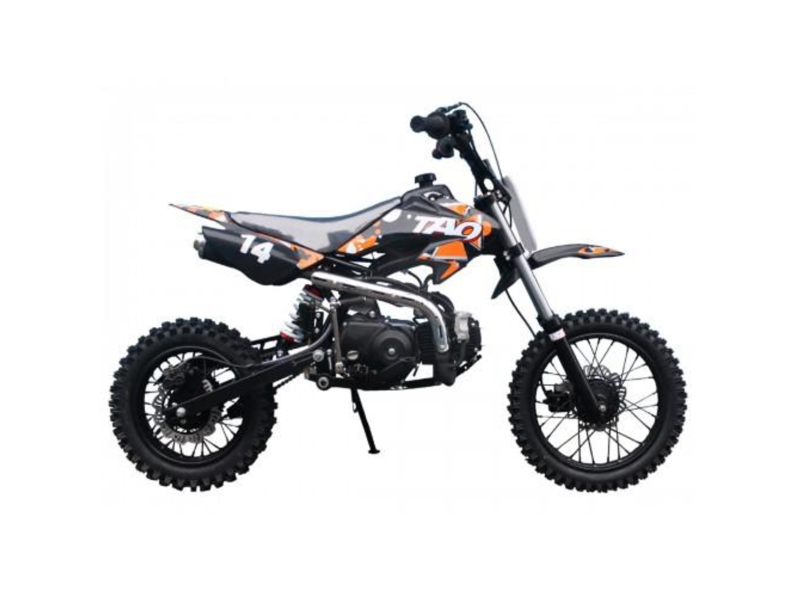 The Tao Motor DB14 is seated in the middle of our dirt bike lineup, the DB14 has become incredibly popular in the past few years, and rightfully so. The perfect bike for young riders ready to take it to the next level. With our ever-reliable and low-maintenance 107cc engine, an easy kick-start design brings your bike alive. The DB14 boasts a four-speed transmission and an automatic clutch, making it the ultimate learning bike. Shifting through gears is straightforward and gives young riders a prime lesson in the essentials of riding. Don’t be fooled by the size of this bike. While standing at just 41 inches tall and 28-inch seat height, it still handles like a bike twice its size. A lightweight yet durable frame and heavy-duty tires can take on any terrain you come across. Dual disk brakes provide plenty of stopping power to bring each ride to an end with zero effort. A sharp overall design and low-profile body style give it that professional flare. Effortlessly cool, the DB14 is here for all of your off-road escapades.